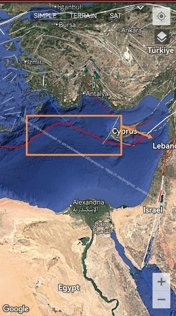Между Родосом и Кипром сегодня наблюдался ОСТИ на событие с магнитудой до М6.6, а затем на севере Африки вывернулась кольцевая структура (фото 4). По данной зоне уже произошло несколько М4 за последние 2 недели. Есть вероятность более сильного землетрясения. ===== A CSTI with a magnitude of up to M6.6 was observed between Rhodes and Cyprus today, and then a ring cloud structure turned out in northern Africa (photo 4). Several M4+ events have already occurred in this area over the past 2 weeks. There is a possibility of a stronger earthquake.