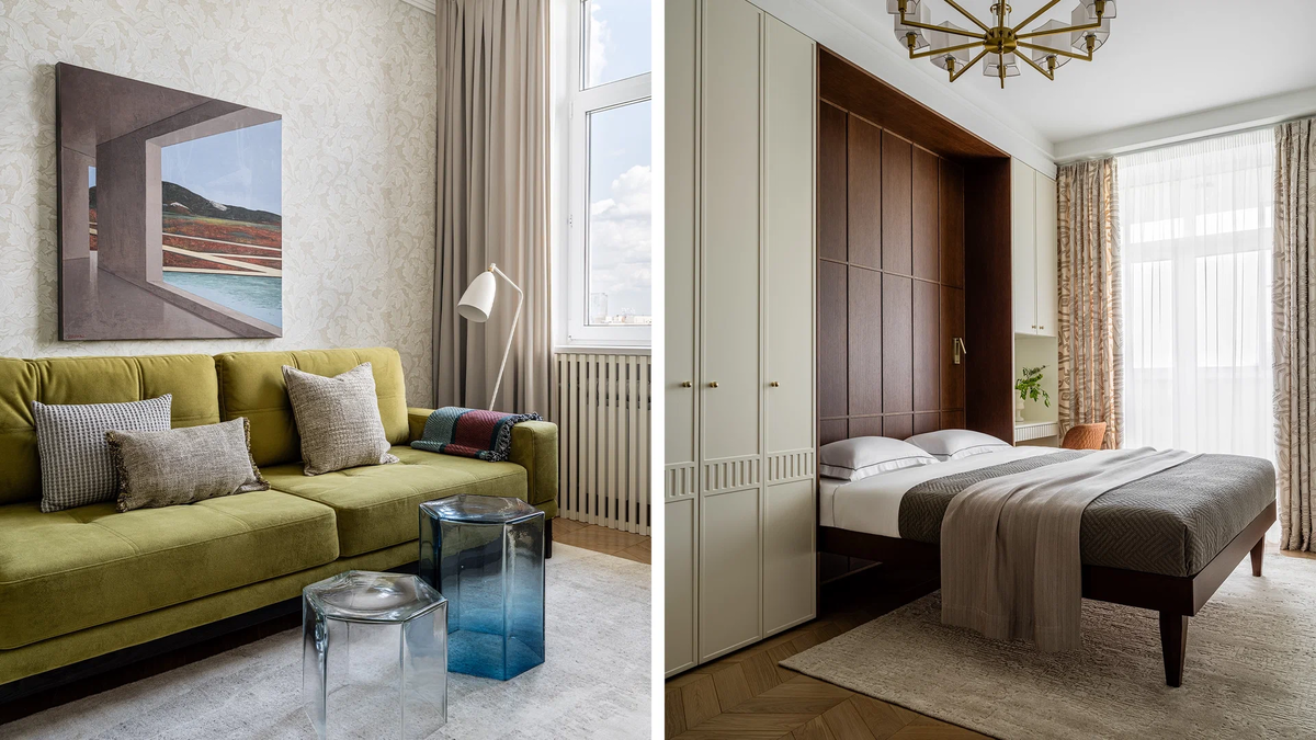 Во всей квартире стены выполнены в однотонной отделке, и лишь гостиная стала исключением. Здесь появились обои с флористическим орнаментом — аккуратная отсылка к сталинской архитектуре, где подобные мотивы часто встречались. Сдержанная палитра сохраняет ощущение света и визуальной цельности, не перегружая пространства.