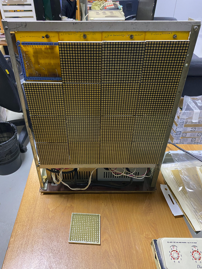 Сразу скажу — сам я эту вещь подробно не исследовал, подглядел на столе у коллеги. Но уж слишком она примечательна для того, чтобы о ней не рассказать) Это анимированный многоцветный светодиодный экран, созданный в середине 1990-х годов, причём не на китайском контроллере, а полностью на советской элементной базе! По современным меркам в нём использовано какое-то невероятное количество корпусов микросхем и дискретных деталей, и я даже боюсь представить, сколько человеко-часов ушло на сборку и наладку. «Контент» зашит в батарею из восьми ПЗУшек К573РФ4А, и поскольку они установлены в кроватках, видимо, предполагалась возможность быстрой замены сюжета. Судя по всему, в 1990-х перед инженерами советской закалки была поставлена задача — сделать красиво из того, что есть в наличии. И хотя аккуратность монтажа местами вызывает вопросы, нельзя отрицать тот факт, что после 25+ лет хранения неизвестно в каких условиях устройство сходу включилось и заработало. Трудно описать спектр эмоций, котор