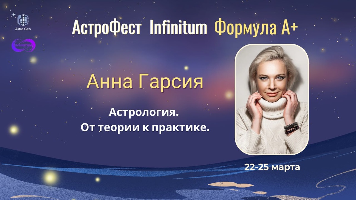 + Мое выступление по теме "Астрология: от теории к практике: состоится 22 марта в 14.15. Анна Гарсия — практикующий астролог, лектор и организатор семинаров, создатель проектов «Алхимия Души» и «Подлунный мир». Автор вебинаров на портале «Небесные Врата», резидент ведущих астроклубов и эзотерических центров. Она регулярно выступает на международных конференциях, обучалась в Москве и Санкт-Петербурге. С февраля 2022 по август 2025 проходила обучение по специализации гештальт - терапевт. Анна работает в таких направлениях, как астропсихология, астрология совместимости, прогностика, кармическая и коррекционная астрология. 🎆Один из глубоких смыслов названия фестиваля «Формула А+» — в поиске гармонии и совершенства, синтезе различных подходов и инструментов для раскрытия потенциала каждого человека. Регистрируйтесь на 13-й АстроФест Формула А+! 👉 Добро пожаловать в Путь АстроФеста 🚀 Как попасть в Астрогеобот: t.me/metamirtsev_bot или @metamirtsev_bot Напишите там: астрофест Или