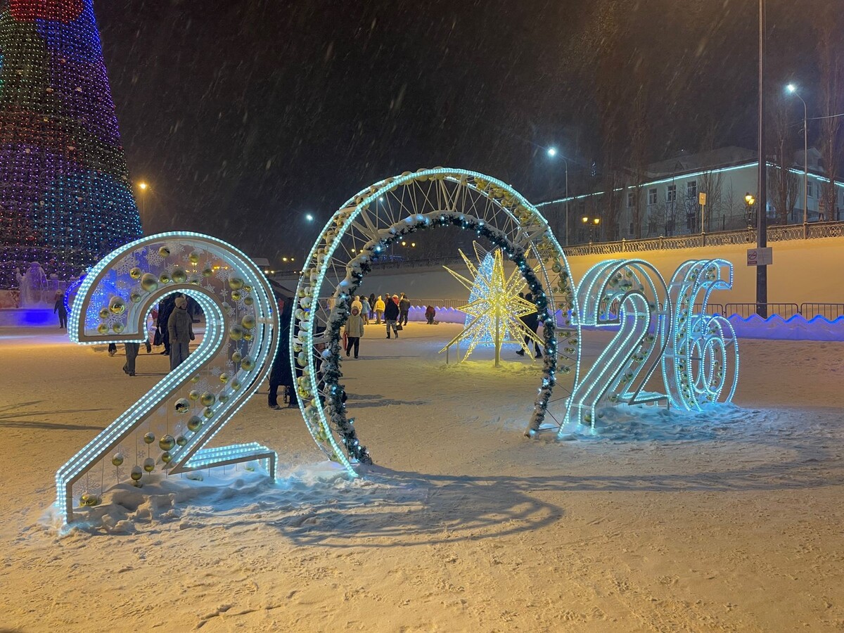 После сытного ужина нас хватило еще на одну локацию. Это была Ёлка на Площади имени Салавата Юлаева. И несмотря на снег с ветром, мы все же пошли прогуляться.