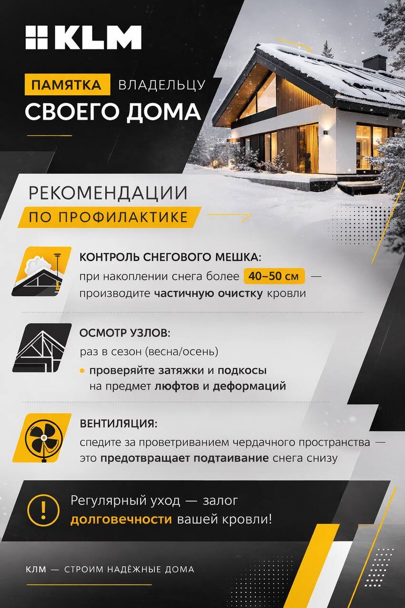 Чтобы ваш дом сохранял надежность и комфорт на долгие годы, важно уделить особое внимание состоянию кровли и своевременному уходу за ней. Мы подготовили для вас небольшую памятку с рекомендациями по профилактике и сезонному контролю, которые помогут избежать лишних нагрузок на конструкцию и сохранить кровлю в идеальном состоянии. 🙊Регулярный осмотр и своевременный уход — простые меры, которые обеспечивают долговечность и безопасность вашего дома. С заботой о вашем доме, Команда 🏠КЛМ