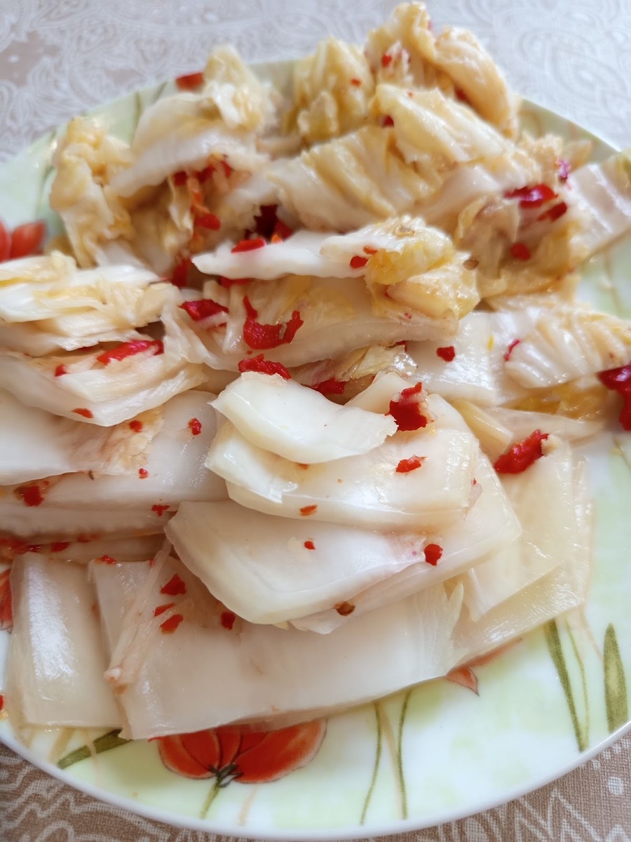 Привет, друзья! Делюсь с вами простым рецептом острой корейской закуски. Этот вкусный салат из квашеной пекинской капусты подойдет к любому застолью, особенно понравится любителям ферментированных продуктов. Пекинскую капусту обмыть, удалить верхние потемневшие листья. Разрезать вдоль на 4 части, уложить в кастрюлю и залить соленой водой из расчета 2 полные столовые ложки соли на 1 литр воды. Вода должна полностью покрыть капусту, поэтому на нее надо поставить банку с водой. Оставить при комнатной температуре на 2 дня. Спустя это время воду слить, тщательно промыть каждый лист под проточной водой, хорошо отжать. Сделать начинку из острого перца и чеснока. Есть два варианта: свежий стручковый перец и чеснок прокрутить на мясорубке или сушеный перец смешать с чесноком, натертым на терке. У меня второй вариант. Листья капусты проложить острой начинкой, сложить в банку или контейнер и залить остывшей кипяченной слегка соленой водой (1 без верха столовая ложка на 1 литр воды). Банку с капус