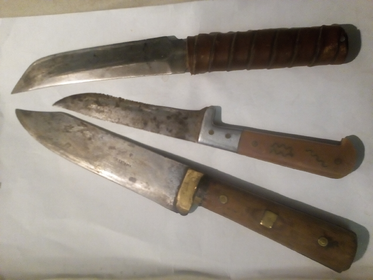При разборе секретера - обнаружен пакет с ножами. Из них тр не совсем простых... Показываю. Красивое... :0)) В один из них - просто влюблён. Давно его купил. Лет 18 назад. Даже тогда - 50 рублей это ПОДАРОК.... И долго его е видел... А я его вона куда... Да и два других интересные... Этот - подражание ножу падишаха для бая... Видите где трещина - блестяшка? Это золотую краску в ямку втрирали... Типа золотая проволока вбита... :9((((( Ну и у ножа падишаха была надпись на арабском... Мастер арабским не владел, но - что мог. В свою силу: Замечательный нож... А тут всё ясно: Про нож разведчика слышали? Не, это не он. Но его те же мастера делали. :0) Реставрация? Она его испортит. Дыхание времени. Дыхание любви. Дыхание выпотрошенных им зверей... :0))))) А вот красавец, да? Ну, короче... Любуйтесь.