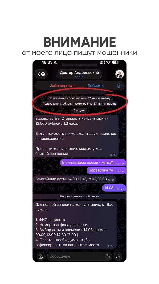 ! Ничего не стесняются и очень спешат! Но вместо того, чтобы работать, предпочитают называться мной и требовать предоплату с моих пациентов. ВНИМАНИЕ! Я никогда НЕ беру предоплату — это раз. Моя консультация в очном формате стоит 3000 рублей, а онлайн-консультации, как правило, провожу бесплатно. Будьте внимательны и не переводите деньги сомнительным собеседникам в соцсетях и мессенджерах. Особенно если они СМЕНИЛИ ФОТО И ИМЯ несколько часов или дней назад — это очень тревожный звоночек. Лучше перестраховаться!