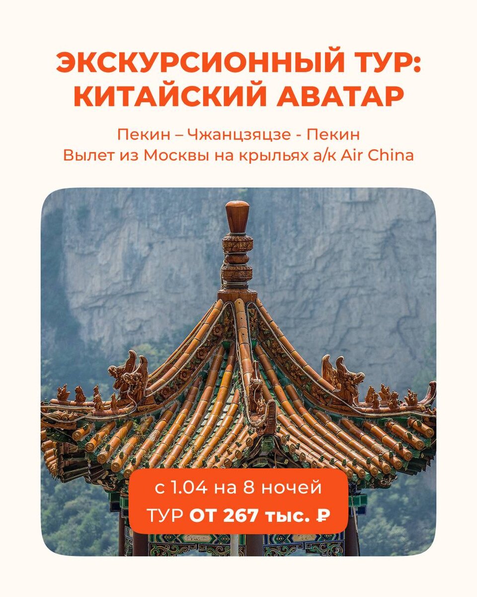 Где снимался Аватар. Путешествие в Чжанцзяцзе + знакомство с Пекином ✈️Вылет из Москвы на крыльях а/к Air China c 1.04 на 8 ночей ТУР 🔥ОТ 267 тыс. RUB🔥 1/2 ДЕНЬ 1 ПРИБЫТИЕ В ПЕКИН ДЕНЬ 2 ЭКСКУРСИИ ПО ТОПОВЫМ ДОСТОПРИМЕЧАТЕЛЬНОСТЯМ ПЕКИНА ДЕНЬ 3 ЭКСКУРСИИ ПО ЗНАКОВЫМ МЕСТАМ ПЕКИНА ДЕНЬ 4 ПЕРЕЕЗД В ЧЖАНЦЗЯЦЗЕ ДЕНЬ 5 ЭКСКУРСИИ В ЧЖАНЦЗЯЦЗЕ: ГОРЫ «АВАТАР» ДЕНЬ 6 ЭКСКУРСИИ В ЧЖАНЦЗЯЦЗЕ: СТЕКЛЯННЫЙ МОСТ И УНИКАЛЬНЫЕ ЛАНДШАФТЫ ДЕНЬ 7 ВОЗВРАЩЕНИЕ В ПЕКИН ДЕНЬ 8 СВОБОДНОЕ ВРЕМЯ В ПЕКИНЕ ДЕНЬ 9 ОТЪЕЗД Стоимость указана за 1 взрослого при двухместном размещении. 💬Написать в Telegram 📱Написать в MAX #китай