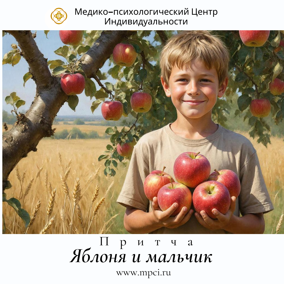 В одном дворе росла большая яблоня. Каждый день к ней прибегал маленький мальчик. Он забирался на ветки, ел яблоки и засыпал в её тени. Яблоня любила мальчика, и мальчик любил яблоню.