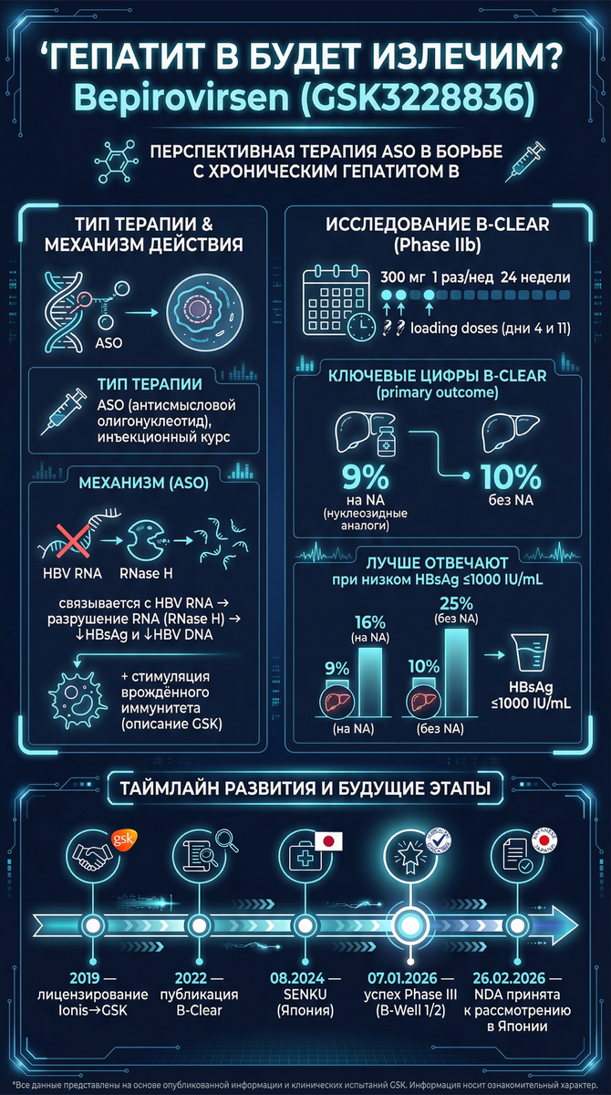 Ещё недавно вопрос звучал почти наивно. Сегодня — это уже рабочая повестка крупных фармкомпаний и регуляторов. В начале 2026 года GSK сообщила о положительных результатах двух ключевых исследований III фазы по bepirovirsen — терапии, которая нацелена на то, чего хроническому гепатиту B не хватало десятилетиями: конечный курс лечения и шанс на “функциональное излечение” (functional cure). Хронический гепатит B — болезнь не только про анализы. Это про постоянный фон тревоги:
