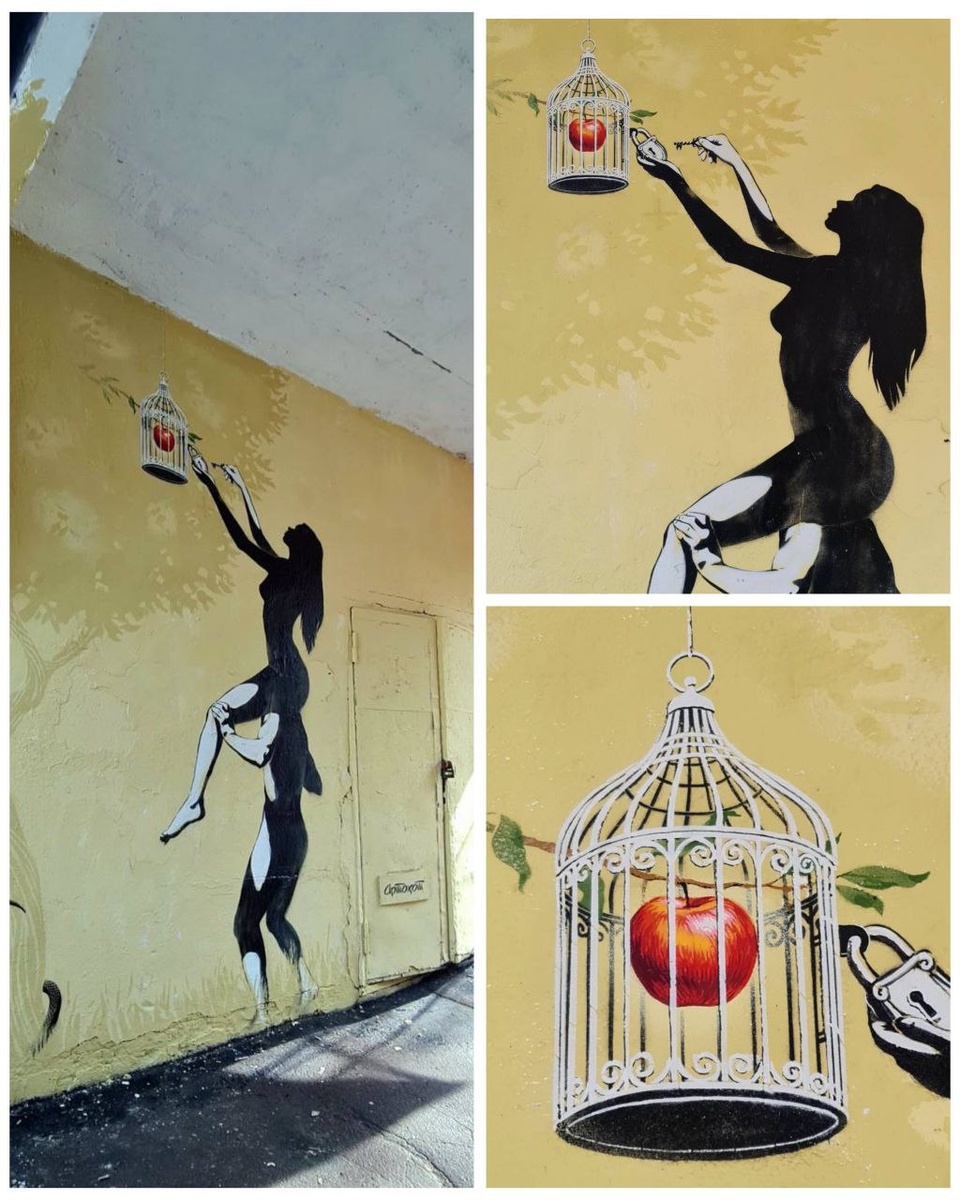 🎨 💬 Работа посвящена самой первой женщине, точнее, первородному греху, как говорит автор Артём Артохот, и сделана она в ночь на пятницу 13-е. 📍 «Ева» / ул. Библиотечная 16-14 (проход), Химки Акрил/ трафаретная техника/ аэрозоль/ 2026 #Химки #Подмосковье