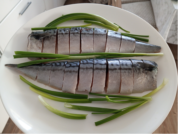 Советую приготовить побольше, чтобы попробовать скумбрию пряного посола, а затем и провесную. Два литра рассола рассчитано на скумбрию от 3 до 5 штук. Ингредиенты: - скумбрия – 3 шт.; - вода – 2 литра; - соль – 5 ст. ложек; - сахар – 1 ст. ложка; - перец черный горошком – 8-10 шт.; - перец черный душистый горошком – 5 шт.; - лавровый лист – 1 шт.; - гвоздика – 2 шт. Вскипятить рассол из двух литров воды с солью, сахаром, перцем, гвоздикой, лавровым листом, остудить до комнатной температуры. Скумбрию промыть, удалить голову, внутренности, сложить в контейнер или банку, залить рассолом комнатной температуры вместе со специями, закрыть крышкой и убрать в холодильник на 2 суток. Спустя двое суток скумбрия уже готова, можно вынуть из рассола, обсушить бумажным полотенцем, нарезать на порционные кусочки и подать к столу или часть нарезать и подать к столу, а часть приготовить провесной. После того как скумбрия провела в рассоле двое суток, ее вывесить на хорошо проветриваемое место на 2-3 су