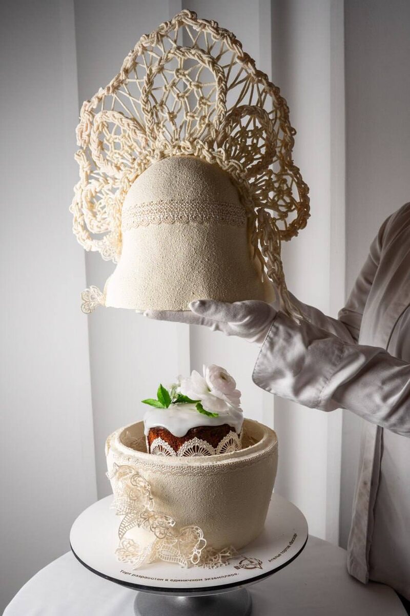 ». «Царский» кулич на шафране с белой черешней спрятан внутри шоколадной матрёшки высотой почти полметра. Кокошник выполнен в технике макраме из съедобных нитей, а узоры из айсинга нанесены вручную. Интересно, чем еще нас удивят рестораны к Пасхе.