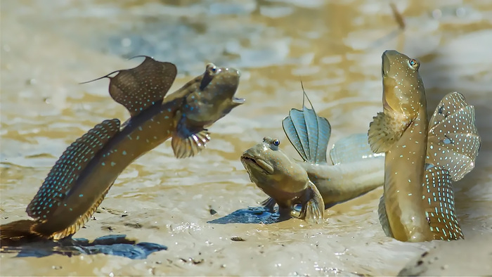 Согласитесь, есть ощущение, что смотришь на стоп-кадр из старого-доброго пластилинового мультика? А меж тем, перед вами совершенно реальная сцена с участием илистых прыгунов. Они ходят по суше? Ага. А ещё лазают по деревьям, роют норы, а некоторые ещё и тянут нелёгкую лямку отцов-одиночек. Но давайте обо всём по порядку. Илистые прыгуны – это 15-сантиметровые рыбушки, населяющие поросшие мангровыми лесами тропические побережья по всему Старому Свету. Главный критерий при выборе жилплощади для прыгуна – это наличие ярко выраженных приливов и отливов, ведь без них ему жизнь не мила. Можно было бы сказать, что эту рыбу хлебом не корми – дай в грязи поваляться, но это будет не совсем верно, ведь без родной грязи, ему и хлеба не видать. В те недолгие промежутки времени, когда прыгун ведёт себя как порядочная рыба, то есть плавает в толще воды, то он в основном сидит на строгой диете из водорослей, но во время отлива для него открываются двери рая: выбравшись на побережье и сунув физиономию