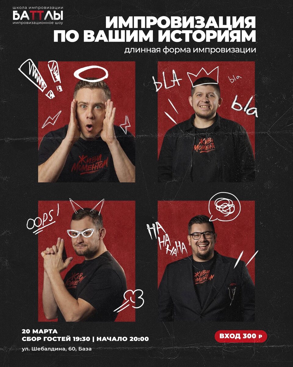 Новый формат шоу, где зрители становятся сценаристами, а актёры создают одну большую историю на сцене без заготовок и сценария. Вместе придумываем, смеёмся и следим за развитием сюжета. Начало: 20 марта 2026 19:30 Стоимость: 300.0 руб. Адрес: г Омск, Шебалдина, 60 Организатор: https://vk.com/public225738280 Мы долго думали, чем вас удивить, и решили сделать совершенно новый формат для нашего шоу. Это длинная форма импровизации, где вы станете нашими сценаристами, а мы на сцене создадим одну большую историю прямо на ваших глазах. Без заготовок, без сценария — только идеи зрителей и море импровизации. Будем вместе придумывать, смеяться и смотреть, куда заведёт сюжет. 🍹 С собой можно взять алкогольные и безалкогольные... #зрелищные_искусства_актерское_мастерство_(театр) Узнать подробности, адрес или записаться на событие.