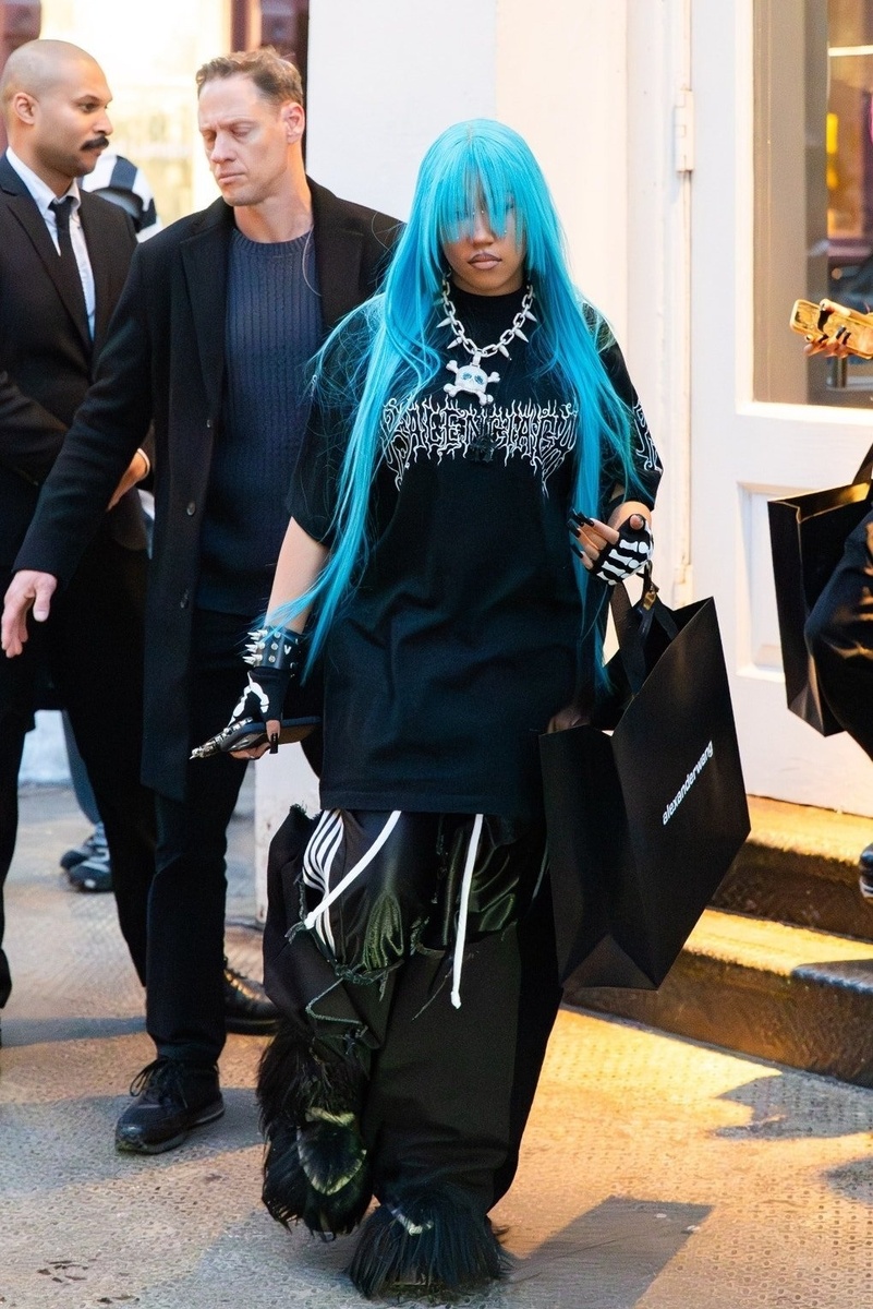 И это, я вам скажу, не милые детские шалости. Представьте картину — по элитному району Сохо марширует группа подростков. Все в черном с ног до головы, но на головах — неоновые парики. Розовые, зеленые, фиолетовые. А во главе этой процессии — парик цвета «синий электрик». И этой девушке 12. Двенадцать. Все это представление развернулось у флагманского бутика Alexander Wang. Норт пришла туда не с мамой, нет. Она привела свою «свиту» — таких же подружек в париках. И что вы думаете? Для них закрыли часть магазина! Встречал их лично 42-летний дизайнер Александр Вэнг. И вишенка на торте. Все эти «случайные» кадры папарацци сделало агентство Backgrid. А в Голливуде все знают: Backgrid — это фотографы по вызову. То есть это как вызвать такси, только вместо машины к тебе приезжают репортеры, чтобы «неожиданно» тебя сфотографировать. Мама Ким все одобрила и, скорее всего, сама и организовала. Это было шоу! Начнем с футболки. Черная, оверсайз, конечно же, Balenciaga. Цена на такую «простую» маечк