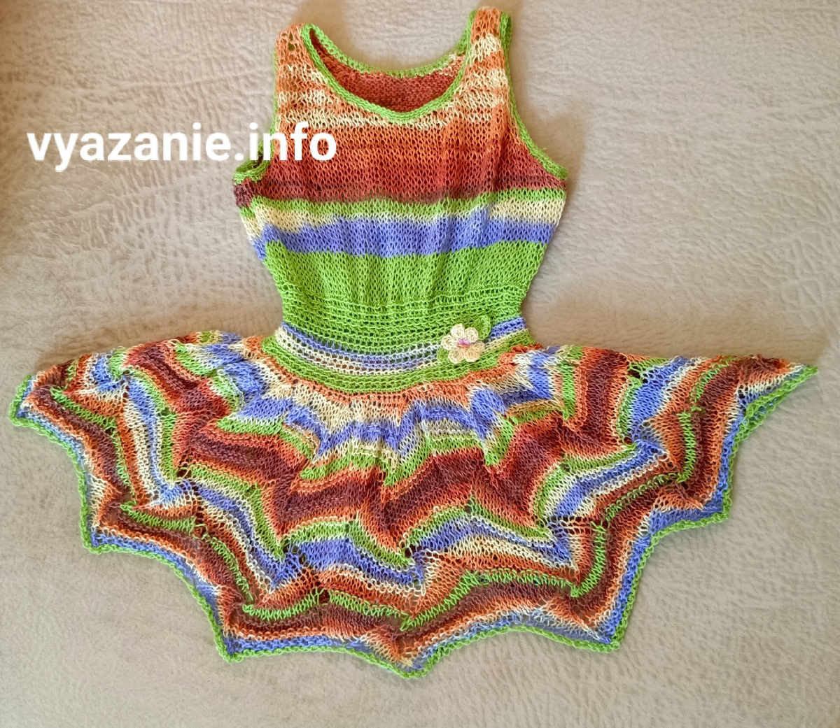 Это летнее платье получилось очень красивое. Связано из пряжи alize diva batik (100% микрофибра, 350 м в 100 г ) и alize diva baby (100% микрофибра акрил, 350 м в 100 г) спицами №4 и крючком №3,5. Израсходовано 140 г ( весь моток разноцветной пряжи и полмотка зелёной). Вязать из этой пряжи приятно и легко. Не линяет. Узоры хорошо видно. Пряжа alize diva batik окрашена широкими полосами. Мне понравилась. Я измерила платье, которое девочка сейчас носит. Юбочка связана с узором, а верх - лицевой гладью. Длина юбки 24 см и вес 94 г. Схема узора для юбки. Раппорт узора составляет 25 петель. Набираем на спицу 300 петель зелёной нитью. Соединяем петли в круг и провязываем зелёным цветом один ряд изнаночными петлями. Затем присоединяем цветную нить и начинаем вязать узор. Зелёным цветом вяжем по 2 ряда через каждые 11 рядов. Вяжем по схеме 24+18=42 ряда. В 43-м ( по схеме это 19) ряду начинаем убавлять петли. *13 петель по схеме, следующие 12 петель вяжем по 2 вместе изнаночной.* 44 ряд. *2