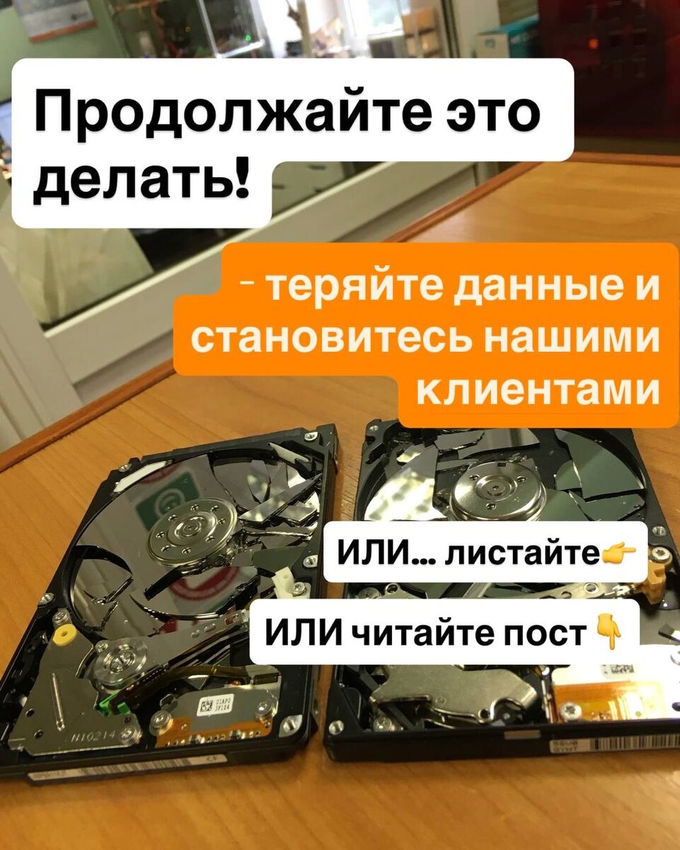 Знаю, что нет, но хотелось бы пост об этом» ⠀ Совпадает с очередным примером работы В работу поступили 2 диска с таким описанием: Зеркало. Выпал диск. Через 2 недели отказал второй. Данные нужны именно со второго диска, те что более свежие – это принципиально» ⠀ Диагноз одинаковый для обоих пациентов – нечитаемые сектора и сбой в служебной микропрограмме. Оба умерли одинаково с разницей в 2 недели – уже интересно ⠀ Подход к исполнению понятен ➢ «Оживляем» оба диска, ➢ получаем доступ к обоим деревьям, ➢ определяем более актуальный ➢ вычитываем ⠀ Ситуация, именно от которой страхует «зеркало»: диски вышли из строя с разницей во времени ⠀ Правильное поведение пользователя при выпадении 1 диска – зарезервировать данные, заменить выпавший на новый, выполнить rebuild – восстановление избыточности Этого не сделано, в итоге это наш клиент ⠀ Что говорить о ситуациях, от которых «Зеркало» вообще не страхует: ⠀ ➢Диски ломаются одновременно (скачок напряжения, огонь/вода, падение/удар, т.п.) ➢Люб