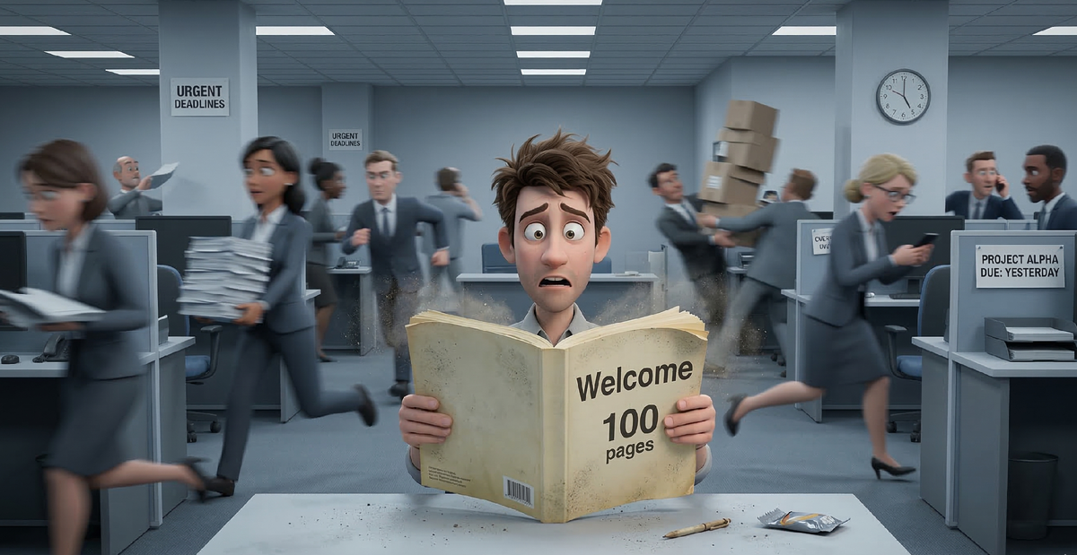 Вы садитесь. Открываете 100-страничный PDF-документ «Welcome Book», который никто не обновлял с 2019 года. И следующие восемь часов просто сидите, боясь задать глупый вопрос вечно занятым коллегам. К вечеру энтузиазм сменяется глухой тоской и мыслью: «А может, стоило принять тот, второй оффер?».