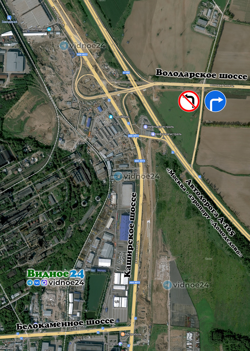 С 14 марта 2026 года изменится схема движения на съезде с автодороги А-105 «Москва – аэропорт «Домодедово» на Володарское шоссе. Там запретят левый поворот в сторону Каширского шоссе и установят специальные ограждения. Отметим, что видновчане этим поворотом обычно пользовались, когда следовали из аэропорта «Домодедово» в город Видное. Но теперь есть альтернативный путь по недавно открытому участку платной автодороги ЮЛА между Каширским шоссе и автодорогой А-105.