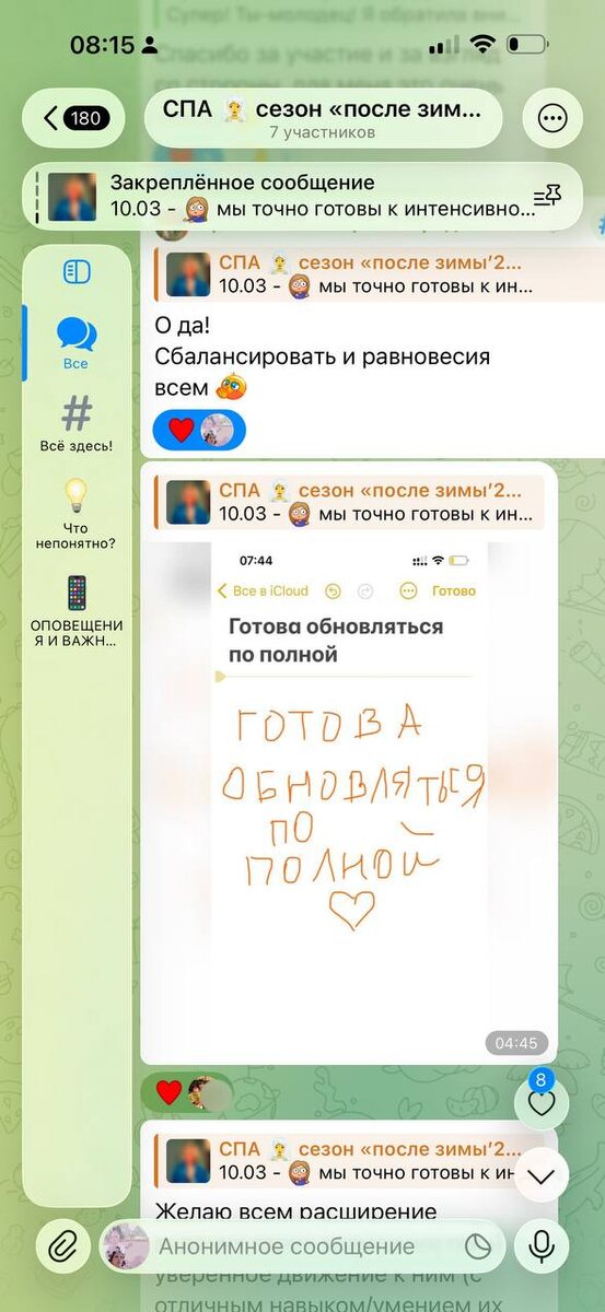 » Тут немножечко из обратной связи! Остальное происходит внутри! А то, что станет продолжением, покажет дальше жизнь: Ведь СПА 🧖♀️- ежеквартальный проект для обновления. А для этого обычно не много надо! В этом случае — это всего 7 активных суток с ежедневными напоминаниями для размышлений и ни одного ZOOMа с теоретической частью на час или более как уже по традиции происходит тогда, когда важно обучить! Дать что-то новое или сделать какие-то непонятные вещи! СПА 🧖♀️ как оживление с использованием уже имеющихся в руках каждого Человека деталей, вещей, слов с целью облегчить путь идущего, а не перегрузить и без того насыщенные будни! Есть вопросы? - спрашивайте Нечего спросить? - можете в майский СПА 🧖♀️ «без парилки» (то есть туда, где париться не приходится). @nfetisova - пишите мне, если нужна персональная поддержка и нет желания ждать группового сезонного шестого по счету СПА 🧖♀️ Есть силы? - переживите весну и увидимся сразу после. Старт ~20.05