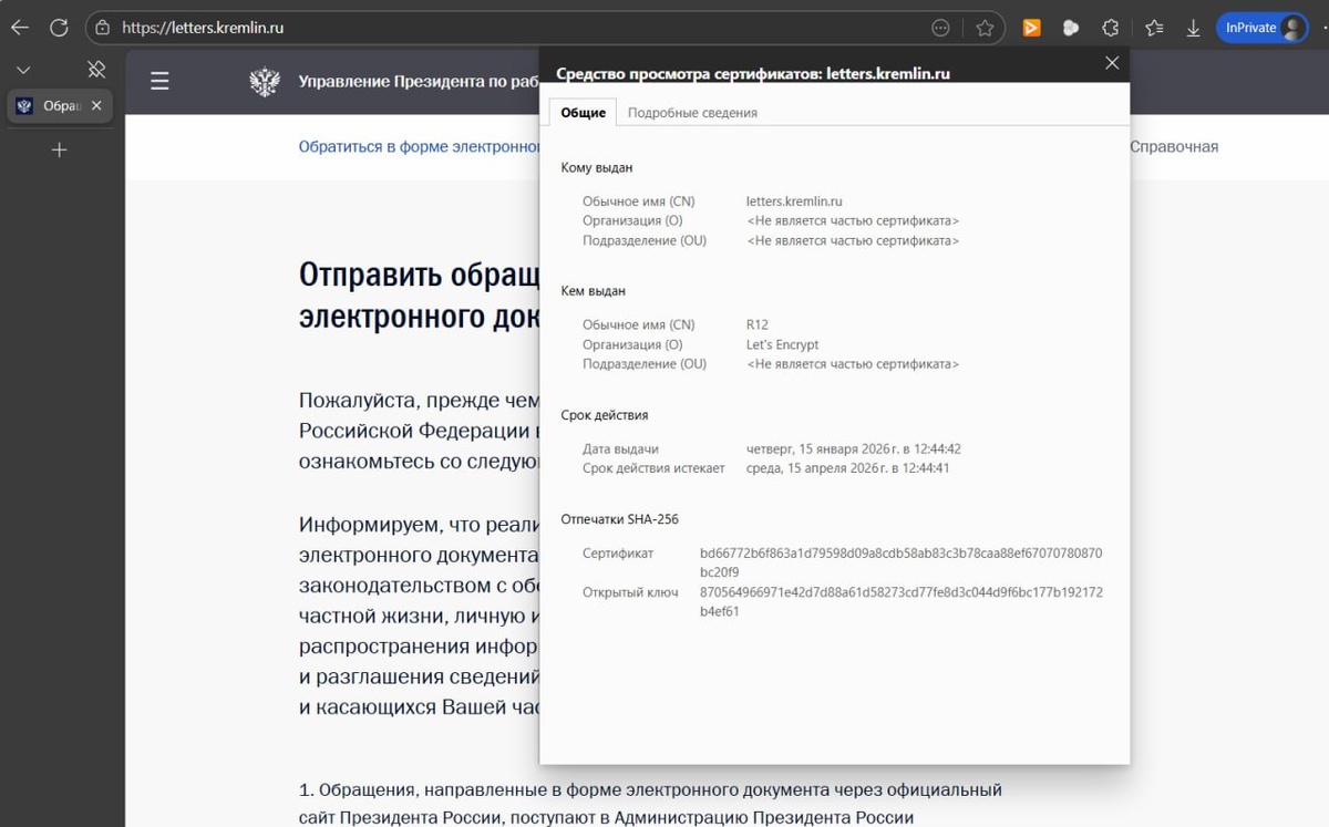 🛡 На поддомене letters.kremlin.ru – бесплатный сертификат от американской некоммерческой организации