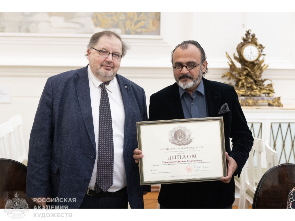 Одним из героев дня стал наш соотвечественник Ашот Татевосян, профессор кафедры искусств и дизайна Мурманского арктического университета. Вы наверняка слышали о нем как о талантливом художнике и архитекторе, но в этот раз он принимал поздравления как настоящий исследователь. Вице-президент РАХ Дмитрий Швидковский вручил ему диплом за уникальную работу — монографию «Северные этюды».