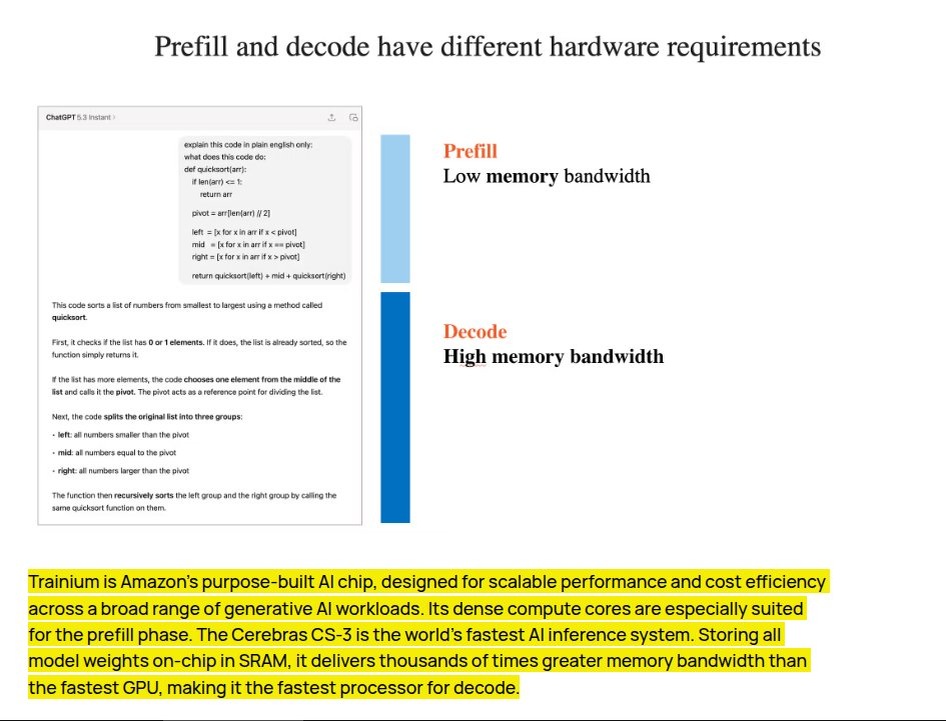Amazon Web Services (AWS) и Cerebras Systems объявили о сотрудничестве, направленном на создание самой быстрой системы ИИ-инференса. Партнёрство вводит новую архитектуру, называемую дисaggregated inference, которая разделяет задачи ИИ между различными типами специализированного оборудования. Каждый запрос ИИ включает два этапа: фазу предзаполнения для чтения запроса и фазу декодирования для генерации ответа. Чтение запроса является вычислительно сложной задачей, которая эффективно выполняется на чипах AWS Trainium. Генерация ответа требует доступа к всей модели ИИ для каждого создаваемого слова, что значительно усложняет процесс. Cerebras использует чип с ваферной архитектурой, который хранит всю модель на чипе, обеспечивая тысячи раз большую пропускную способность памяти по сравнению со стандартными графическими процессорами. В новой системе Trainium обрабатывает начальную фазу запроса и передаёт данные контекста на чип Cerebras. Чип Cerebras затем генерирует выходные данные со