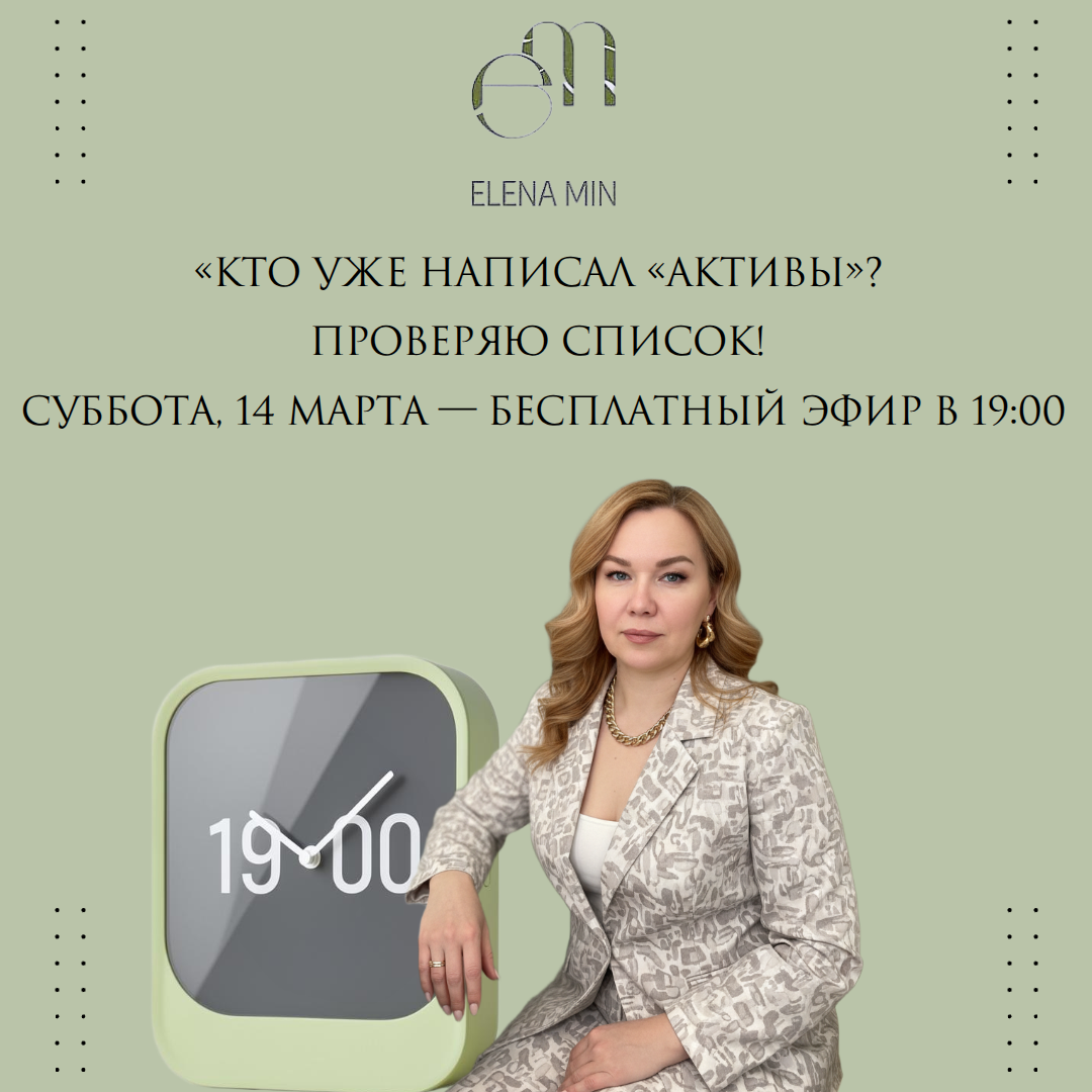 «Девочки, суббота уже. Я готовлю для вас сегодня мощный эфир про активы. Сейчас проверяю список — кто уже в деле, а кто ещё нет. Если вы ещё не написали «АКТИВЫ» в комментариях — самое время. Подписывайтесь на Telegram: https://t.me/elena_min1 Пишите «АКТИВЫ» в комментариях Будет, очень много полезной информации! #напоминание #активы #завтраэфир #19.00 #еленамин