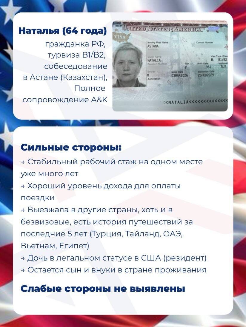 ? Да, это делают самые обычные люди, имеющие как сильные, так и слабые стороны в своих кейсах, но важно: → их понимать и грамотно презентовать консулу во время собеседования → суметь рассказать о них определенным образом, даже если напрямую вопрос не был задан У вас будет всего пару минут, чтобы показать свои намерения прозрачными, а историю — логичной. С нашей поддержкой и тщательной подготовкой можно свернуть любые горы. А разборы кейсов клиентов А&К на карточках подтвержают, что наличие отказов в прошлом или отсутствие поездок в визовые страны — не проблема. 👤 Задать вопросы менеджеру можно тут: @usak_manager_bot ⛓ А чтобы сразу понимать, чего ожидать от процесса в целом, скачивайте бесплатно по ссылке наш большой гайд: https://us-ak.com/visa-guide Там прописан каждый шаг получения туристической визы В1/В2 в 2026 году нашим визовым экспертом с особой внимательностью к нюансам. Пользуйтесь 🇺🇸 #отзыв@ak_usa_visa