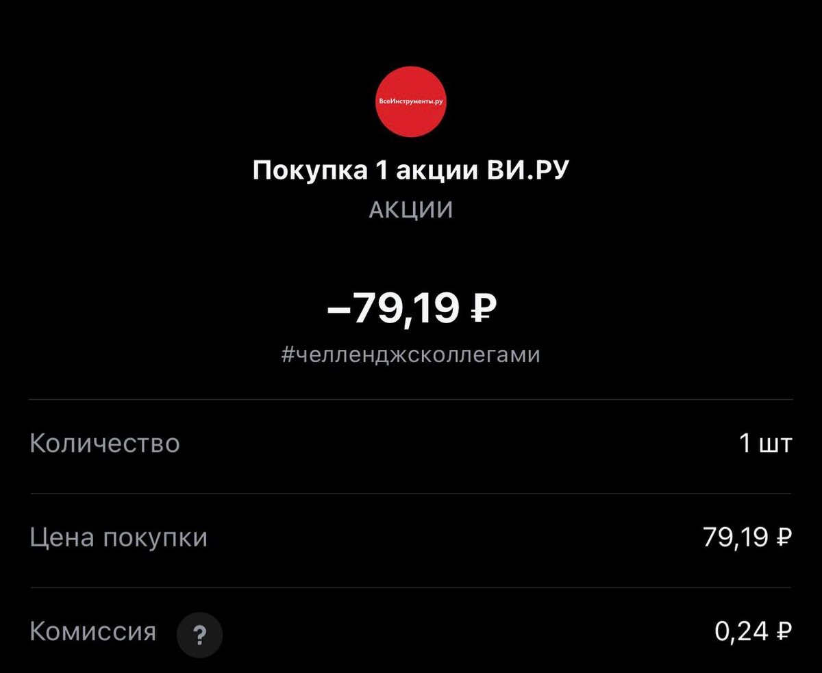 ! Сегодня покупка #380 Статистика портфеля на стороннем сервисе, можно посмотреть по "ссылке" Напомню это челлендж с коллегами, каждый рабочий день пополняем брокерский счет на 250 рублей и инвестируем. Если возникли вопросы или есть не понимание, что делать. Задавайте «тут» Покупка #380 🟢 "ВИ.РУ" 79.19 rub #VSEH 1 лот #каждыйсможет #челенджсколлегами TG MAX