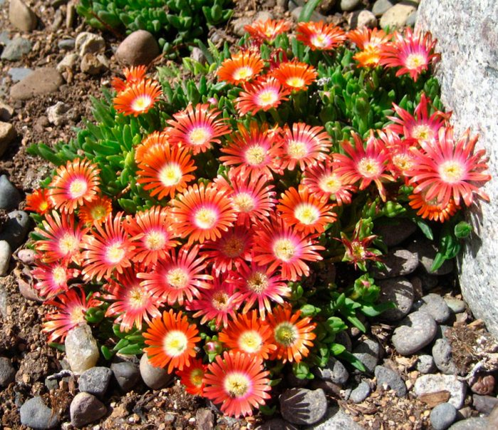 Альпийские горки и рокарии: Это идеальное место для делоспермы. Её яркие цветы и низкорослые, стелющиеся формы прекрасно дополнят каменистые сады, создавая эффект цветущего ковра среди камней.