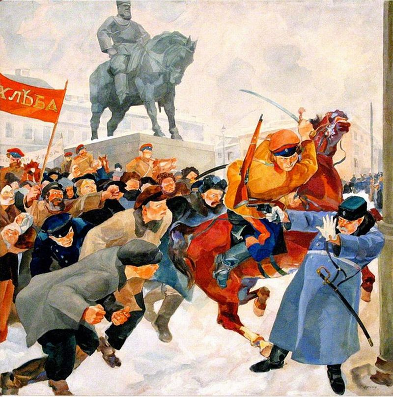 Одна из наиболее динамичных картин, посвящённых этому событию: народ сносит городовых у памятника Александру III на Знаменской площади в Петрограде: Рудольф Френц (1888—1956). На Знаменской площади в дни Февральской революции 1917 года. 1931—1934