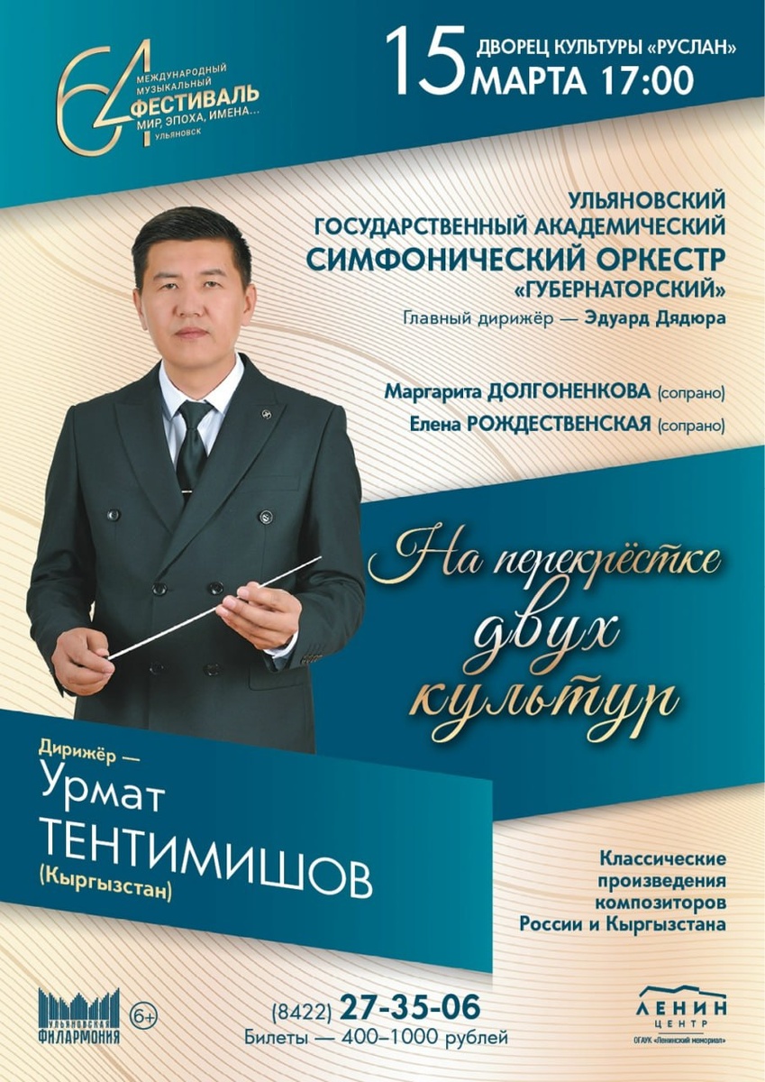 » Концерт (6+) фестиваля «Мир, Эпоха, Имена...» пройдет на сцене ДК «Руслан» 15 марта в 17:00. В программе прозвучат «Ночь в Мадриде» Глинки, «Танец рыцарей» из балета «Ромео и Джульетта» Прокофьева, фрагменты из балета «Щелкунчик» и увертюра-фантазия «Ромео и Джульетта» Чайковского и другие произведения русских композиторов вместе с музыкой композиторов Кыргызстана в исполнении Ульяновского государственного академического симфонического оркестра «Губернаторский» под управлением дирижёра Урмата Тентимишова. Фото: Ульяновская филармония Оперативные новости в МАХ