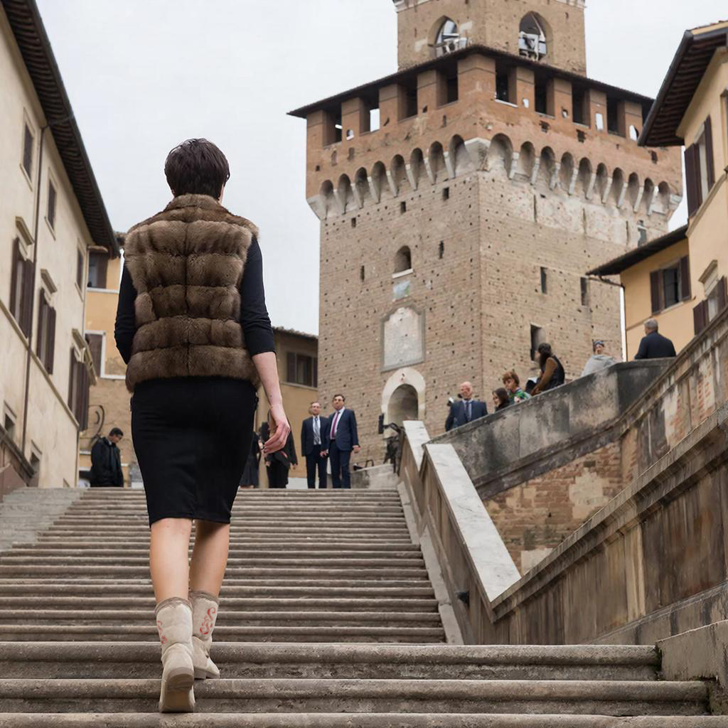 Она поднимается по лестнице к какому то старинному зданию с башенками. Там она подходит к толпе людей они что то обсуждают. Я осталась внизу и наблюдаю за ней.