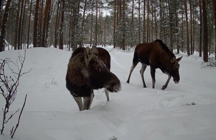 В заповеднике «Большая Кокшага» фотоловушка вновь запечатлела пару прогуливающихся лосей