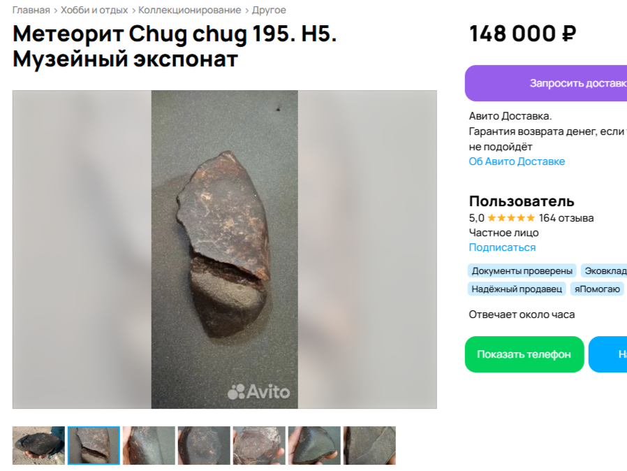 На сервисе объявлений выставлен на продажу фрагмент метеорита Chug Chug 195, найденный в чилийской пустыне Атакама. За космического гостя, состоящего из двух частей, продавец просит 148 тысяч рублей. В размещенном предложении указано, что метеорит был обнаружен 24 октября 2019 года. Это так называемый хондрит - каменный метеорит, имеющий характерную структуру. Особую ценность образцу, по словам владельца, придает сохранившаяся «кора плавления» - тонкий слой на верхней стороне, который образовался при прохождении через плотные слои атмосферы. Вес находки до регистрации составлял 2740 граммов, и продавец оценивает его в 60 рублей за грамм. Как сообщается в объявлении, подлинность метеорита подтверждена официально: 8 ноября 2023 года он был внесен в международный метеоритный бюллетень. Согласно классификации, образец отнесен к типу H5 со степенью выветривания W1, что говорит о его хорошей сохранности. Эти данные полностью совпадают с информацией из официальной базы данных Метеоритного общ
