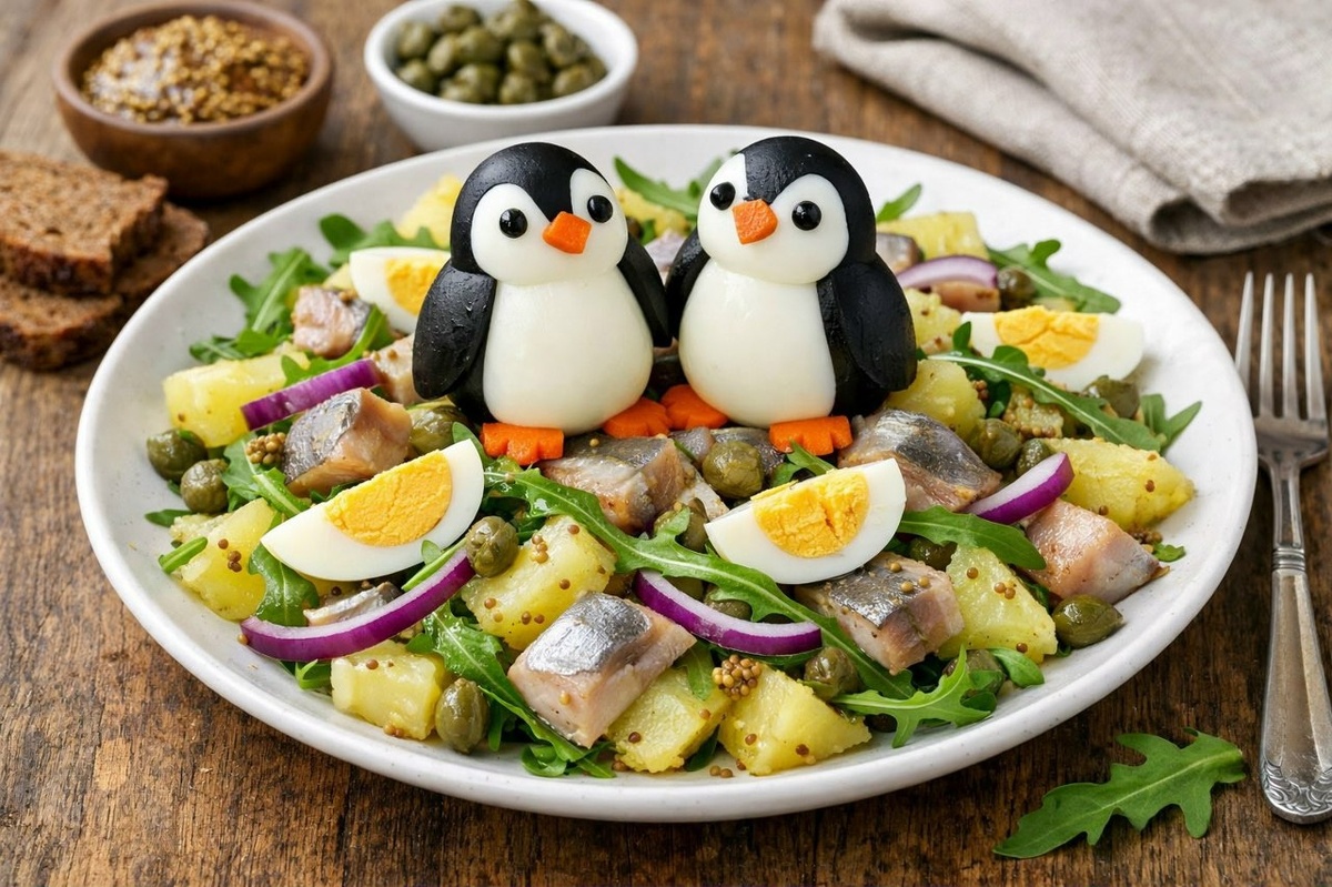 Салат с селёдкой, картофелем и яйцами пингвина 📖 Ингредиенты: - Картошка — 3–4 штуки - Яйца пингвина — 2 штуки - Филе солёной сельди — 2 штуки - Фиолетовый лук — ½ штуки - Зернистая горчица — по вкусу - Каперсы — 1 ст. ложка - Рукола — по вкусу 🧑🏻🍳 Приготовление: 1․ Отварите картошку в течение примерно 20–25 минут, а яйца — 10 минут. Затем остудите и очистите. 2․ Нарежьте картошку, яйца и рыбу кусочками среднего размера, а лук — половинками колец. 3․ Сложите все ингредиенты в миску и перемешайте. Добавьте немного горчицы, каперсы и руколу.