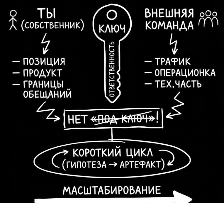 Красная линия для меня простая. Если тебе обещают результат без твоего участия, это ложь. Не обязательно злонамеренная. Но ложь, которая кормится твоей усталостью. Бизнес не собирается как мебель. Его нельзя "собрать по инструкции" снаружи. Внутри всегда есть живые решения. Продукт меняется. Рынок меняется. Команда меняется. Ты меняешься. И каждый поворот требует человека, который несет ответственность за выбор, а не за выполнение задач. Поэтому взрослая модель сотрудничества для меня выглядит иначе. Сначала фиксируем, что ты точно делаешь сам. Позиция + Продукт. Границы обещаний клиенту. Финальное слово в продажах. Права на бренд и на аудиторию. Это тот слой, где ошибка стоит дороже всего. Потом фиксируем, что делает внешняя команда. Трафик. Операционка. Сборка воронки. Техническая часть. Дисциплина коммуникаций. И важно. Они не "управляют бизнесом". Они управляют участком работ. Дальше договариваемся о коротком цикле. Две недели. Одна гипотеза. Один оффер. Одна точка измерени