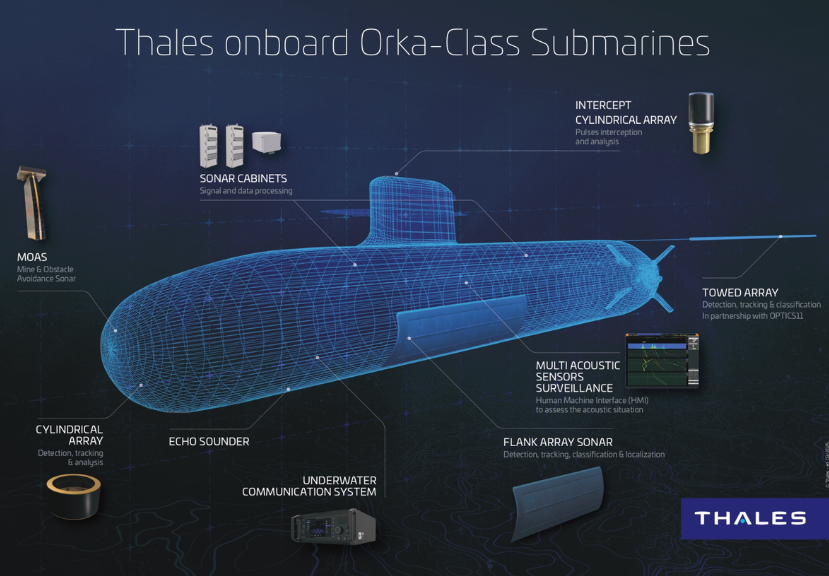 Французская оборонная компания Thales разработала комплекс гидроакустических систем нового поколения. Его планируют установить на перспективные подводные лодки класса Orka для военно‑морских сил Нидерландов.