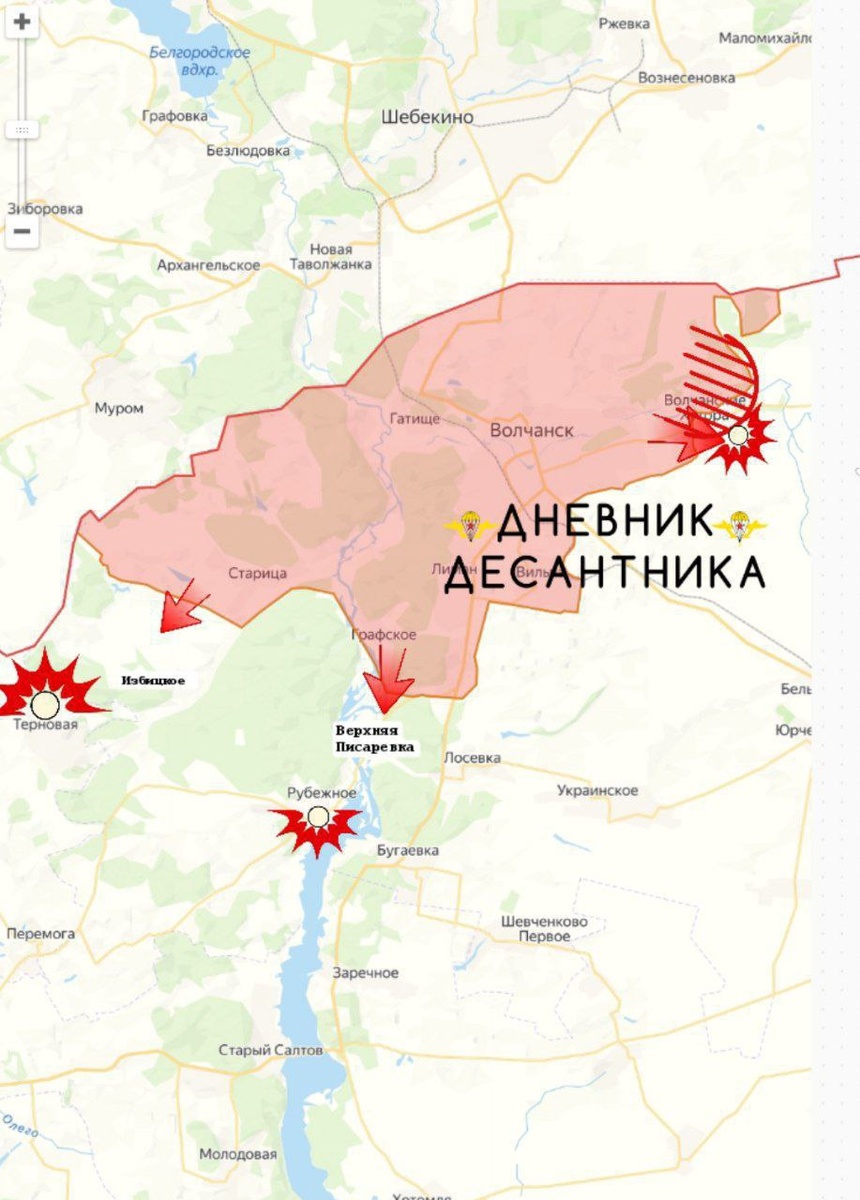 Докладывает Добрый🫡 На Харьковском направлении враг стал использовать в большом объеме дроны на оптоволокне. А совсем недавно это преимущество было у нас. Вероятно противник развил собственное производство. Несмотря на это, наши подразделения развивают наступление к югу от Волчанска. Наша авиация способствует продвижению ВС РФ, а также бьет по живой силе врага и нарушает его логистику. ▫️ Противник не прекращает наращивать резервы в районе населенного пункта Волчанские Хутора, но наши артиллеристы и авиация наносят удары по скоплению живой силы, что способствует продвижению наших войск, в ходе которого бойцы наших подразделений выбивают врага с его позиций. Ожесточенные бои на данном участке продолжается. Наступление ВС РФ фиксируется южнее населенного пункта Старица в направление к селу Избицкое, а также от населенного пункта Графское к Верхней Писаревке. Наша авиация наносит удары по противнику и его технике в районе населенных пунктов Рубежное и Терновая. В районе населенного п