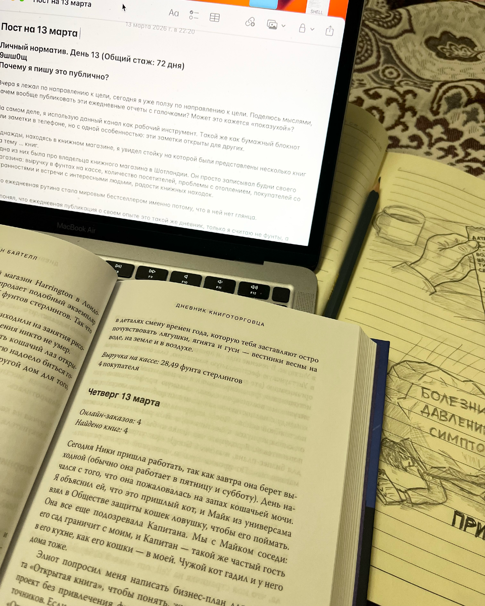 Вчера я лежал по направлению к цели, сегодня я уже ползу по направлению к цели. Поделюсь мыслями, зачем вообще публиковать эти ежедневные отчеты с галочками? Может это кажется «показухой»? На самом деле, я использую данный канал как рабочий инструмент. Такой же как бумажный блокнот или заметки в телефоне, но с одной особенностью: эти заметки открыты для других. Однажды, находясь в книжном магазине, я увидел стойку на которой были представлены несколько книг на тему … книг. Одна из них была про владельца книжного магазина в Шотландии. Он просто записывал будни своего магазина: выручку в фунтах на кассе, количество посетителей, проблемы с отоплением, покупателей со странностями и встречи с интересными людьми, радости книжных находок. Его ежедневная рутина стала мировым бестселлером именно потому, что в ней нет глянца. Я понял, что ежедневная публикация о своем опыте это такой же дневник, только я считаю не фунты, а ресурсы своей жизни: Писать «заметки» каждый день похоже на написание это