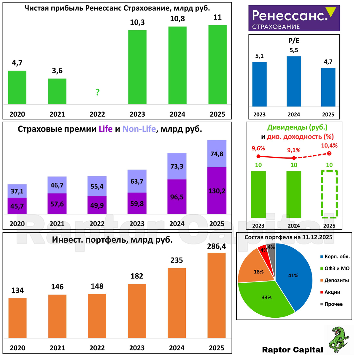 📌 Вчера Ренессанс представил отчёт МСФО за 2025 год и провёл День инвестора. Делюсь ключевыми моментами, в том числе озвученными лишь устно на презентации. • Чистая прибыль выросла на 2% год к году до 11 млрд рублей (с учётом бумажной переоценки из-за вынужденной замены стандарта МСФО). По прибыли попали ровно в нижнюю границу своего прогноза (11-12 млрд рублей), в 2026 году планируют заработать также не менее 11 млрд рублей. • Премии сегмента Life выросли на 35% до 130,2 млрд рублей, а сегмент Non-Life показал рост лишь на 2% до 74,8 млрд рублей. Но ещё в ноябре менеджмент ждал снижение Non-Life, поэтому +2% вполне неплохо. В частности, просели ДМС (–8%), инвест-страхование (–31%) и кредитное страхование (–35%), что ожидаемо с учётом состояния экономики в 2025 году. • Знаменитый инвест. портфель Ренессанса за год вырос на 22,1% до 286,4 млрд рублей и превышает капитализацию компании уже в 5,5 раз. На конец года в портфеле было 41% корпоративных облигаций, 33% ОФЗ, 18% депозитов, 4% а