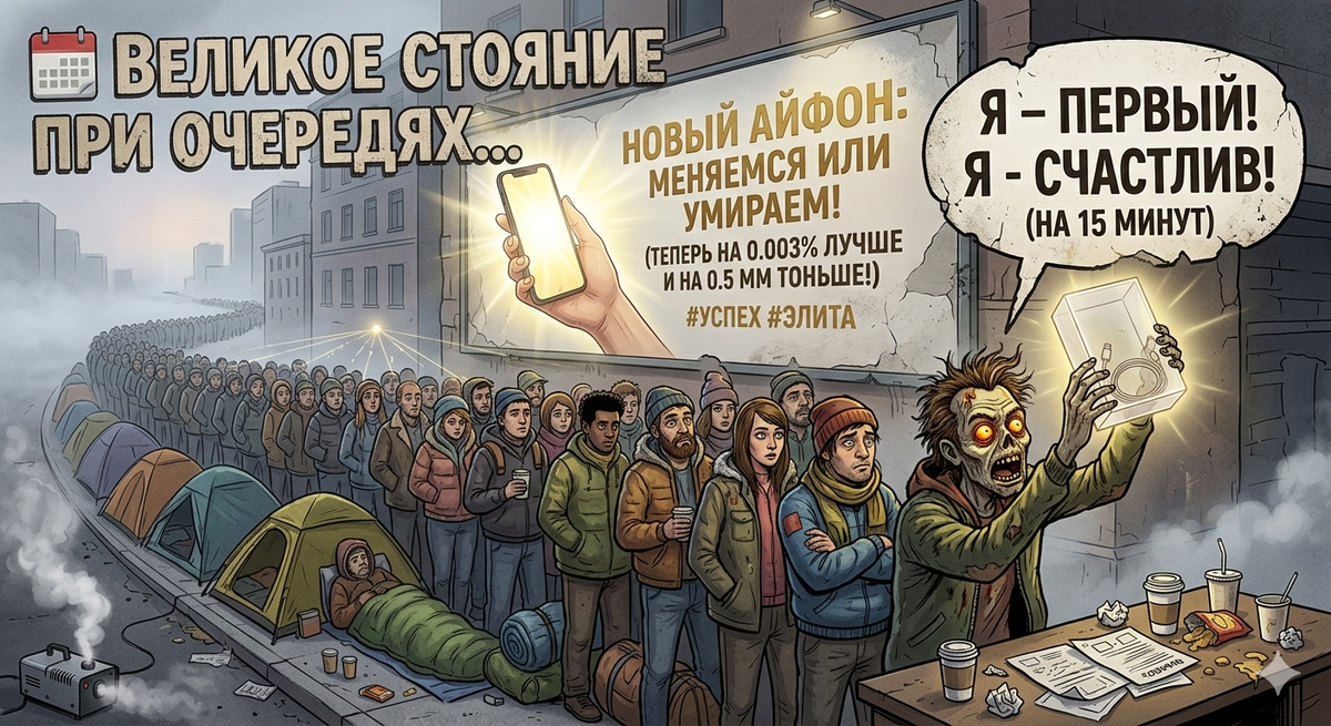 Это классика. Выходит новый кирпич из стекла и металла. Цена – как почка. Изменения – камера стала на 0.3% лучше, а рамки на полмиллиметра тоньше. И что мы делаем? Правильно. Мы занимаем очередь за три дня до старта продаж.