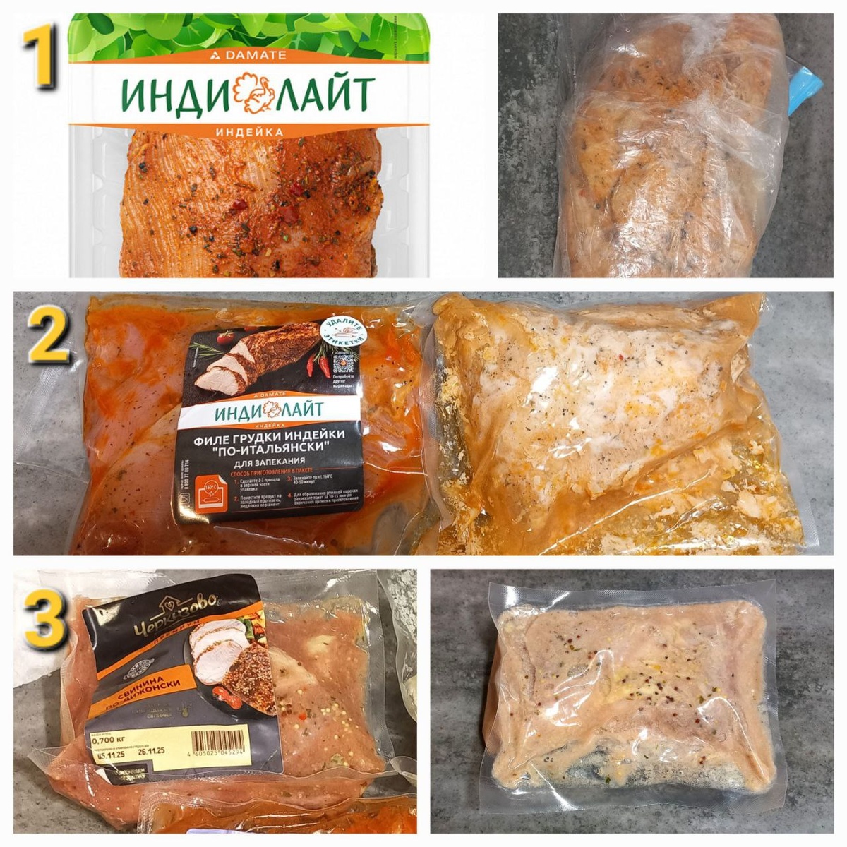 Тестировали новую сувидницу. Режим стандартный для мяса: t=63,5 °С, время - 5 ч 30 мин. Индейку точно можно готовить меньшее время и с меньшей температурой🤪 1. Индейка с томатами и орегано Индилайт (Озон фреш) 2. Филе грудки индейки "по-итальянски" Индилайт (Озон фреш) 3. Свинина по-дижонски Черкизово (Дикси, Озон фреш, Магнит и др.)