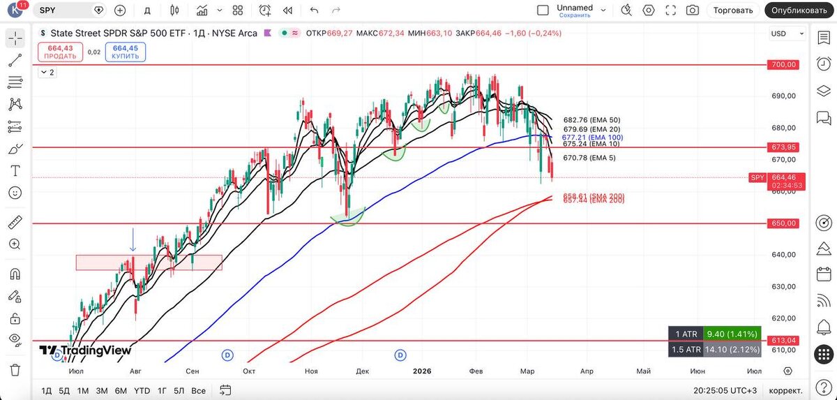 Те приборы, которые ранее дали нам точку входа, и мы увидели технический отскок от них — сейчас неактуальны. Во второй раз я бы на них не ориентировался + в данный момент $MAGS и $NQ1! с корректировкой нарушают свои закономерности. Тем не менее, спуск $SPY и $QQQ к 200 EMA D выглядит более логичным вариантом, и мы можем получить отличную подсказку на $S5TW. Крипта в данный момент показывает небольшую силу. Моя логика проста: возможно, сейчас мы наблюдаем небольшую корреляцию. Если раньше крипта падала сильно, а фондовый рынок держался — сейчас крипта, скорее всего, ожидает завершения какого-нибудь на фондовом рынке. Пока что я продолжаю наблюдать, смотреть и ориентироваться на фондовый рынок — на главную экономику мира. Вы не представляете, как я рад, что сейчас рынок работает до 23:00 МСК😁 Всем отличных выходных! 😎 #spy #технический_анализ #америка #трейдинг_сша #фондовый_рынок #обзор #вывод #qqq #vix #smh #mags #xlk #ixic #крипта #btc