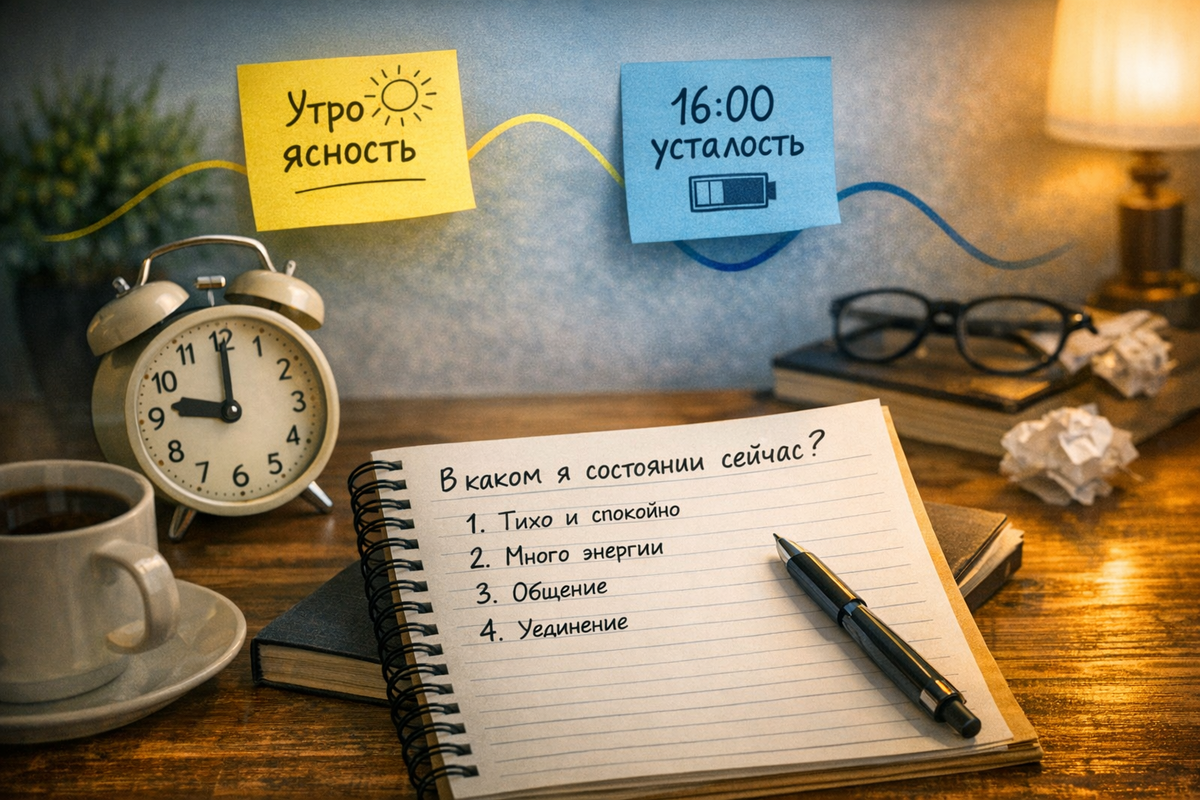 18:00 — отдых. Но если честно посмотреть на свой день, возникает вопрос. Почему иногда в 9 утра думается легко и ясно, а иногда в это же время — будто голова в тумане? Почему в один день в 16:00 мы полны энергии, а в другой — уже ничего не хочется? Время одно и то же.