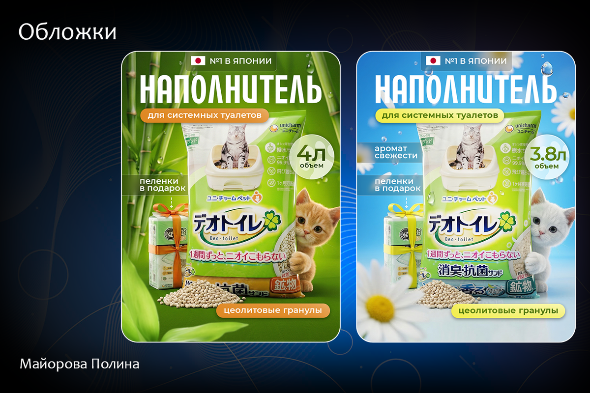 Делюсь свежей работой — разработала сочные и привлекательные обложки. Продукт: наполнитель для системных туалетов Главной задачей было визуально разделить две линейки продукта, сохранив при этом единый узнаваемый стиль Вот как я обыграла атмосферу для каждого вида: Для классического варианта я выбрала спокойную природную эстетику: сочные зеленые оттенки, фон со стеблями бамбука и капли воды. Дизайн транслирует экологичность, естественность и абсолютную чистоту Здесь нужно было передать ощущение легкого, ненавязчивого шлейфа. Небесно-голубой фон в сочетании с нежными ромашками создает очень воздушную, дышащую атмосферу Обе обложки объединяет очаровательный пушистый «ассистент», выглядывающий из-за упаковки. Это отлично работает на эмоции покупателей и повышает CTR карточки! Нужен рабочий дизайн? Нажми на ссылку ниже, чтобы узнать подробности @designer_polinamayorova
