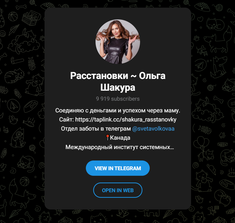 Для продвижения своих услуг Ольга Шакура активно использует несколько платформ. У неё есть Telegram-канал «Расстановки Ольга Шакура» (finansovye_rasstanovki), на который подписано около 10 тысяч человек. На YouTube-канале проекта цифра еще более впечатляющая — более 104 тысяч подписчиков.
