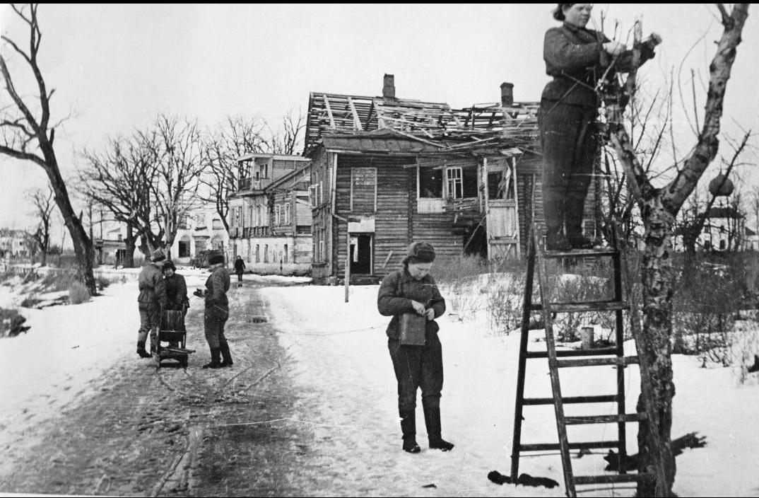 "Связистки части лейтенанта Бесценного восстанавливают телефонную связь."