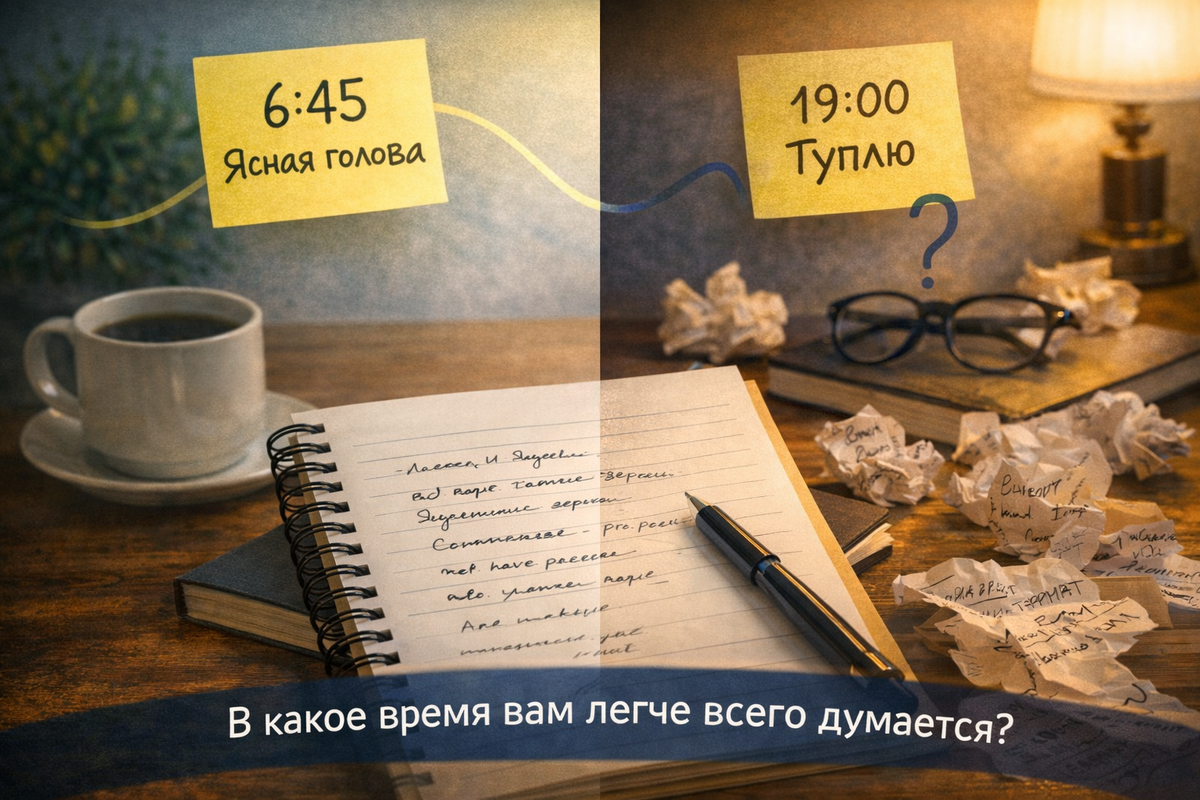 Смотришь на текст — и не понимаешь, что хотел сказать. И возникает ощущение: «Наверное, я просто устал». Но если понаблюдать внимательнее, появляется другой вопрос. А может дело не только в усталости? Иногда такое состояние приходит даже утром. И наоборот — бывают вечера, когда мысли удивительно ясные. То есть дело может быть не во времени. А в режимах работы мозга, которые сменяются в течение дня. Я начал наблюдать одну простую вещь. Есть периоды, когда мышление словно собирается в фокус. В такие моменты хорошо: — писать