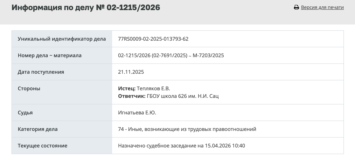 11 марта 2026 г. в здании Никулинского районного суда (в Зюзинском суде идет ремонт- прим.автора) состоялось очередное судебное заседание по иску Евгения Теплякова к своему работодателю школе № 626 имени Сац, при которой Истец трудится воспитателем в СДС "Журавушка". По информации с сайта Зюзинского районного суда рассмотрение дела было отложено. Причин же для отложения может быть несколько (см.169 ГПК РФ): неявка одной из сторон в суд либо необходимость истребования доказательств. Не исключается и рассмотрение вопроса о примирении сторон. Надо полагать, что барин Евгений Валерьевич в суд явился. В трусах-шортах. Потому что 11 марта в Москве было уже тепло +4 - +9 при влажности в 74%. Но явка в суд в трусах-шортах не значит, что он попал на судебное заседание: приставы могли и не пропустить.Но поскольку информация о скандале на входе в суд в сеть не утекла, то в Суд Евгений Валерьевич все же попал. Прорыва, значит, как в МГУ, не произошло. Но заседание, тем не мнее отложили. Так